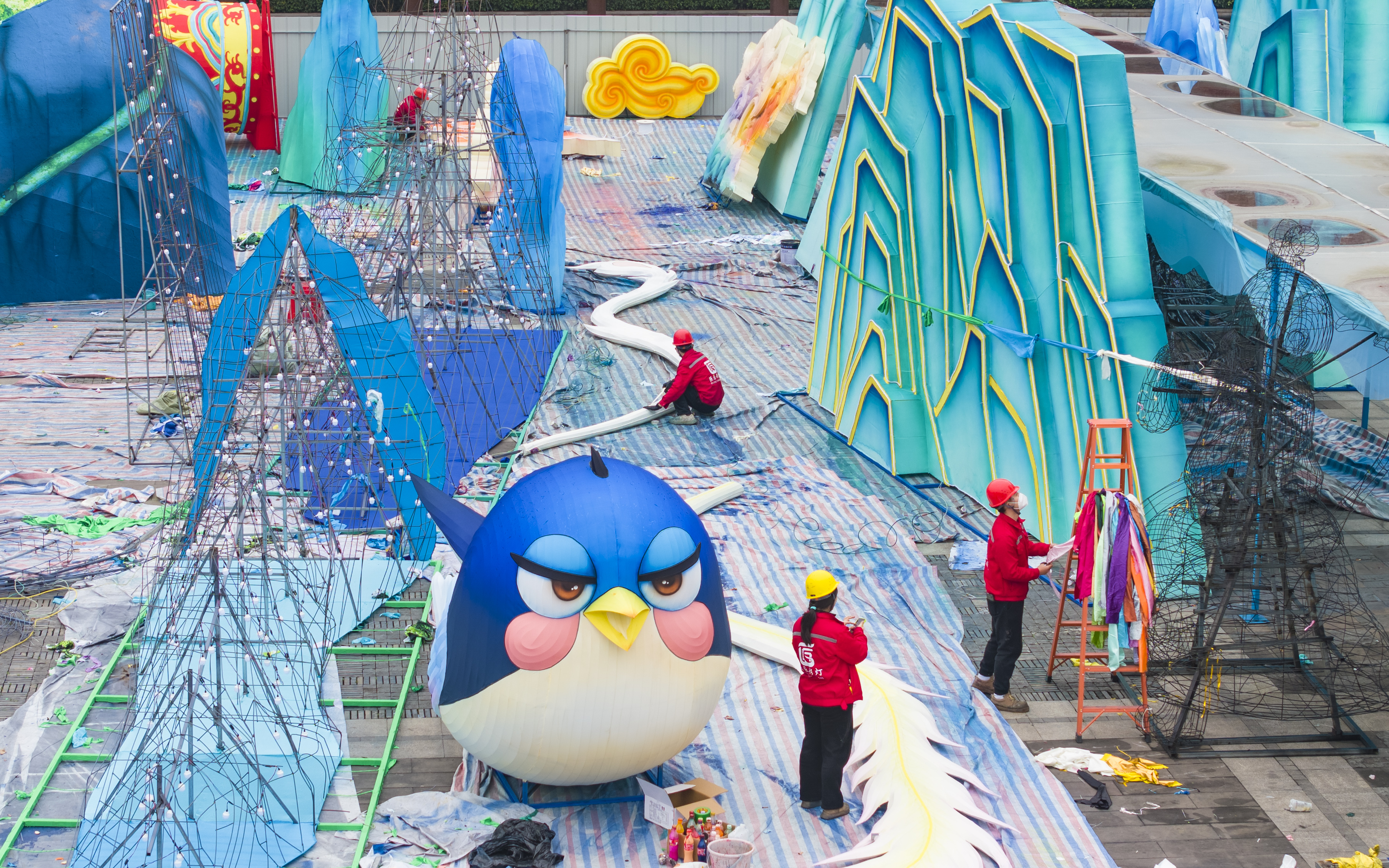 ▲2026重慶市新春燈會(huì)——“禧歡霓”園博園大型水上燈會(huì)現(xiàn)場(chǎng),工人正加緊搭建各種造型的彩燈。記者 齊嵐森 攝/視覺(jué)重慶