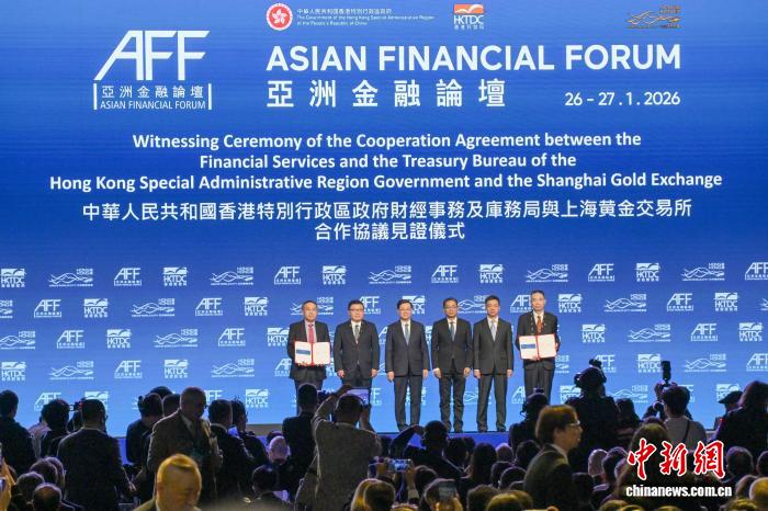 1月26日,在香港揭幕的第19屆亞洲金融論壇上,香港特區(qū)政府財(cái)經(jīng)事務(wù)及庫(kù)務(wù)局與上海黃金交易所簽署合作協(xié)議,推動(dòng)兩地黃金市場(chǎng)合作。圖為香港特區(qū)行政長(zhǎng)官李家超(左三)、中國(guó)人民銀行副行長(zhǎng)鄒瀾(右三)等嘉賓見證簽署合作協(xié)議?!≈行律缬浾?陳永諾 攝