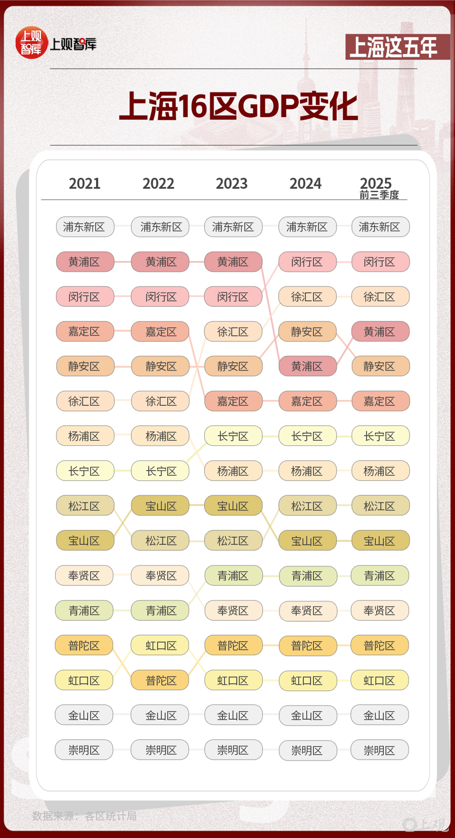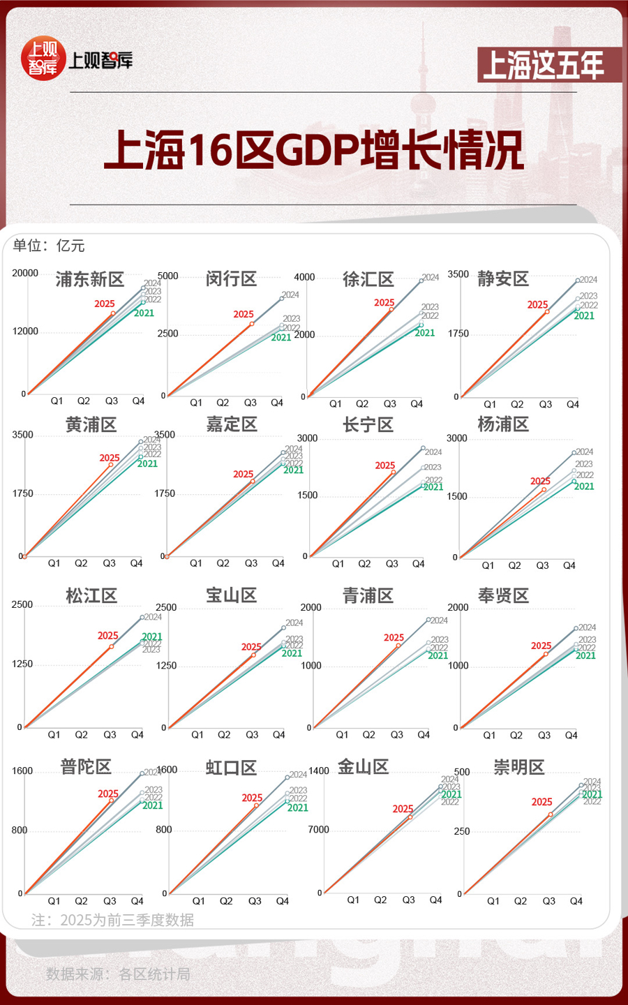 區(qū)域?qū)用?,上?6區(qū)GDP的變化,體現(xiàn)出從中心向多極擴(kuò)散的趨勢。2021年,浦東新區(qū)GDP占全市近36%,而到了2025年,這一比重下降至約33%。其他區(qū)在這五年間,充分發(fā)揮自身優(yōu)勢,齊頭并進(jìn),為上海發(fā)展創(chuàng)造了更多增長極。