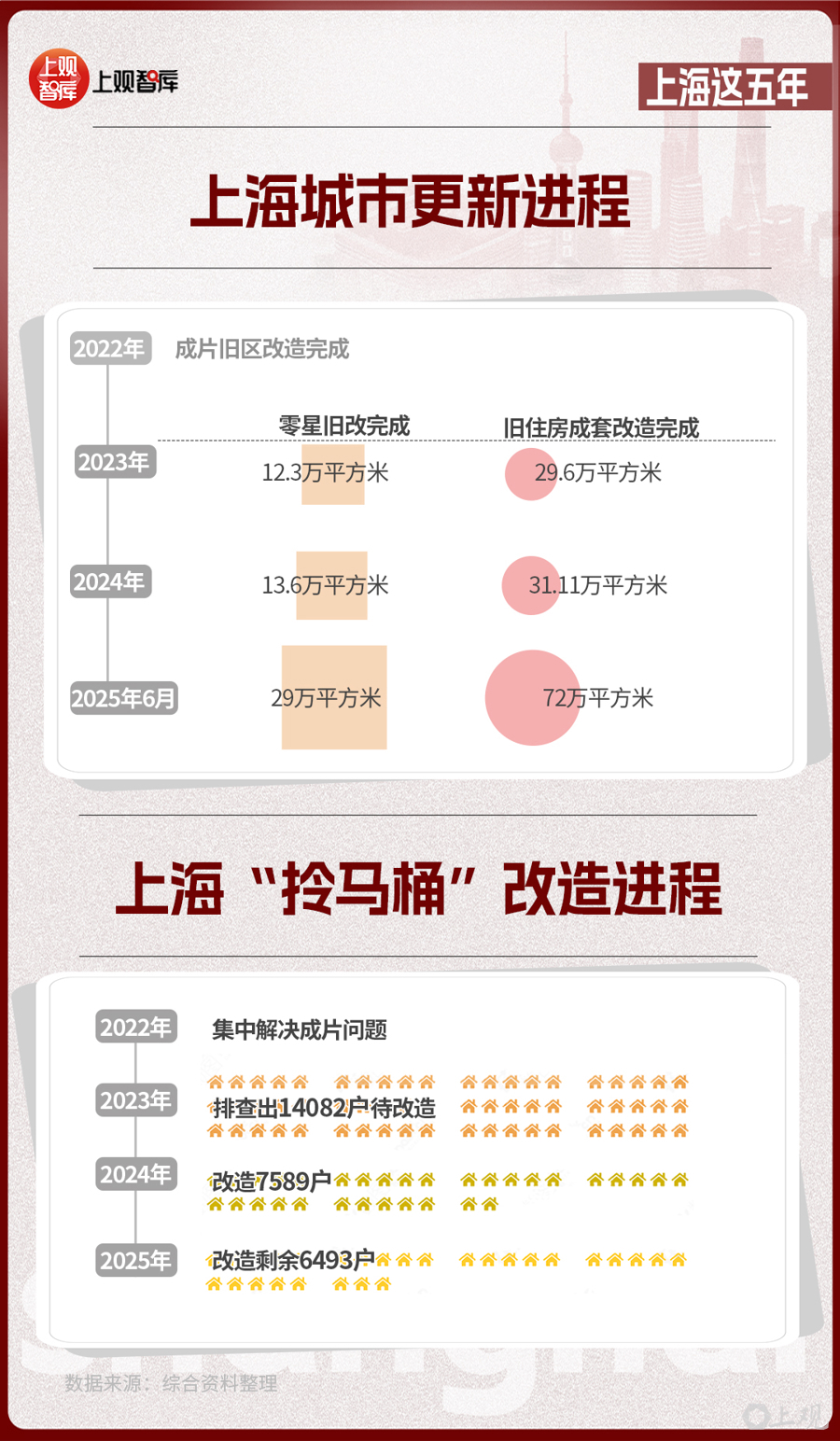 2022年,上海市成片舊區(qū)改造完成;此后,上海加力推進(jìn)“兩舊一村”改造。2023年到2025年6月底,零星舊改完成約29萬平方米,舊住房成套改造完成約72萬平方米,城中村改造認(rèn)定44個項目,完成老舊小區(qū)改造3910萬平方米,提前完成舊改核心任務(wù)。