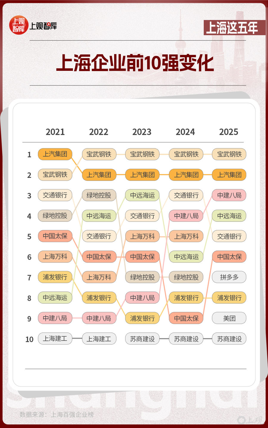 這份由上海市企業(yè)聯(lián)合會、上海市企業(yè)家協(xié)會、上海市經(jīng)濟(jì)團(tuán)體聯(lián)合會和解放日報社共同發(fā)布的榜單,從2021年到2025年,見證了傳統(tǒng)企業(yè)的轉(zhuǎn)型與創(chuàng)新企業(yè)的涌現(xiàn)。在前10強(qiáng)的名單中,制造業(yè)仍然是上海產(chǎn)業(yè)的壓艙石,而房地產(chǎn)、建筑企業(yè)從2021年占比達(dá)40%,到2025年占比降低為20%?;ヂ?lián)網(wǎng)企業(yè)在2025年沖上前10強(qiáng),并占據(jù)了20%的席位,亮出了上海經(jīng)濟(jì)多元發(fā)展的成績單。