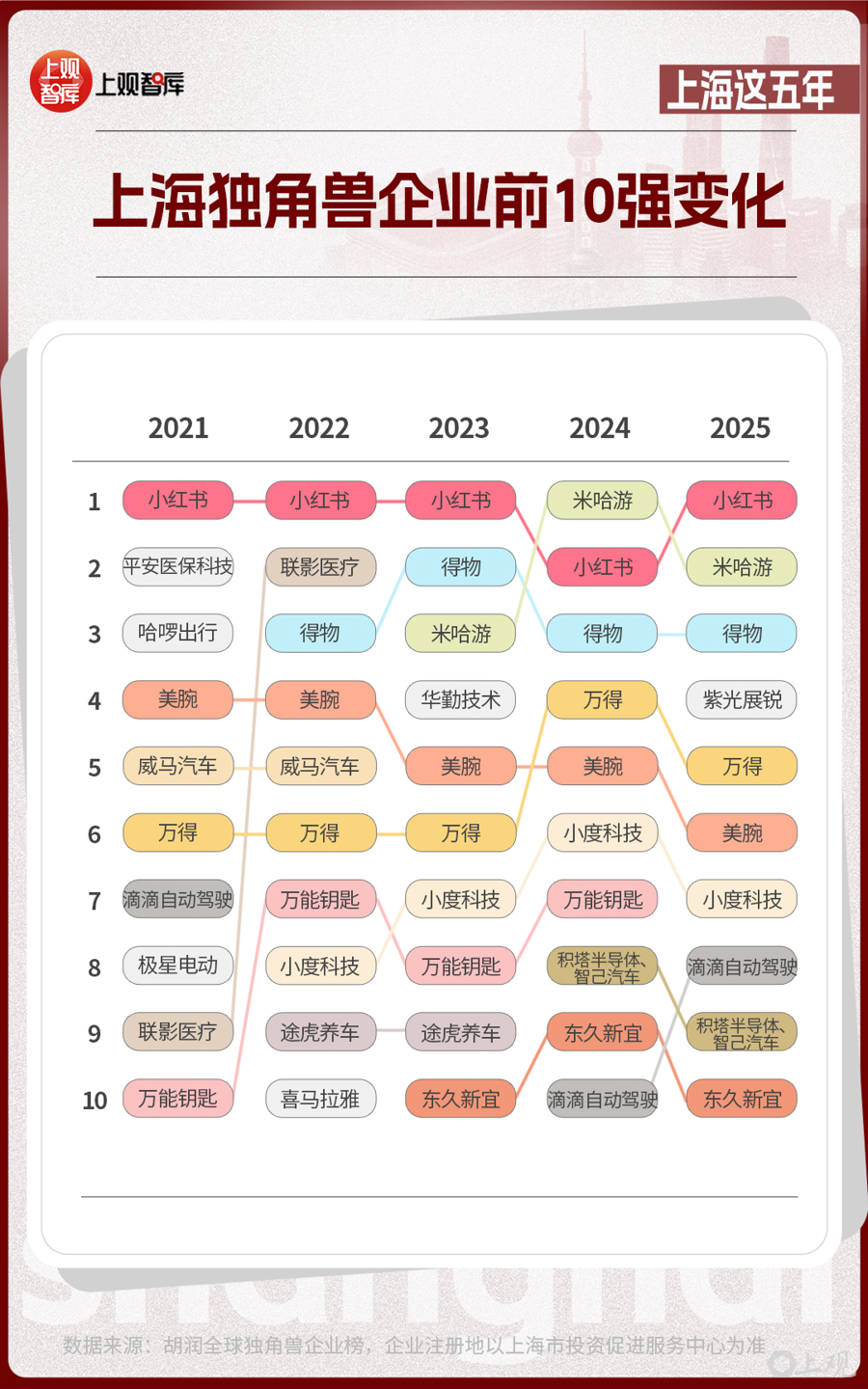 前10位的上海獨角獸企業(yè),從2021年到2025年,發(fā)生了不小的改變。有的企業(yè)已經(jīng)上市,如聯(lián)影醫(yī)療、華勤技術(shù)等;有的企業(yè)悄然退場;有的企業(yè)仍持續(xù)霸榜,如小紅書、米哈游、得物、美腕、萬得。獨角獸企業(yè)的變動與產(chǎn)業(yè)趨勢息息相關(guān)。當(dāng)新能源汽車產(chǎn)業(yè)進(jìn)入高質(zhì)量發(fā)展的階段時,智己汽車接過領(lǐng)軍大旗;在AI芯片成為市場熱點時,積塔半導(dǎo)體、紫光展銳已躋身芯片新勢力代表之列。
