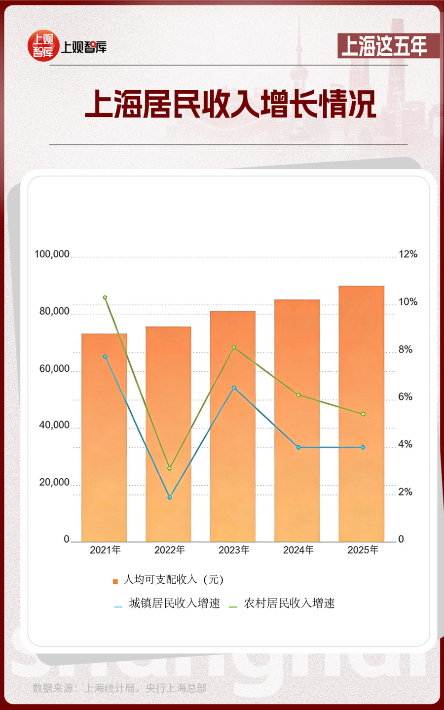 2025年,上海人均可支配收入超過了9萬元,對比2021年增長了17.9%;人均消費(fèi)支出逼近5.5萬元,對比2021年增長了12.0%;全市社會消費(fèi)品零售總額增長4.6%。