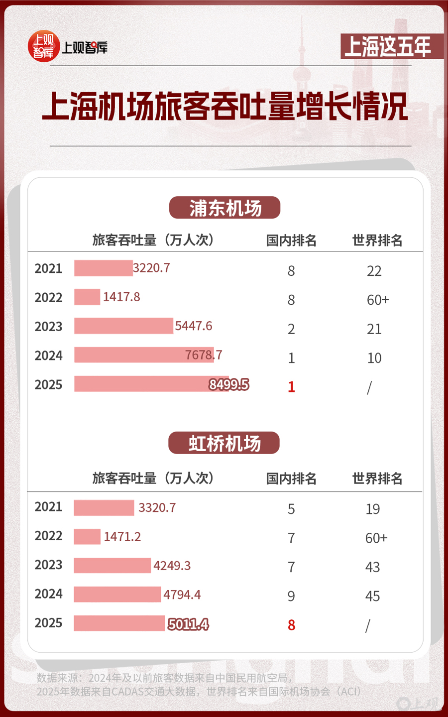 2024年,上海浦東國際機(jī)場首次排名全國旅客吞吐量第一,榮登中國最繁忙的機(jī)場。也是在這一年,上海港成為全球首個年吞吐量超過5000萬標(biāo)準(zhǔn)箱的世界大港。