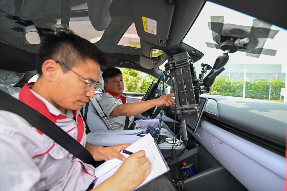 測(cè)試員在一輛智能網(wǎng)聯(lián)汽車內(nèi)做測(cè)試。新華社記者 孫凡越 攝