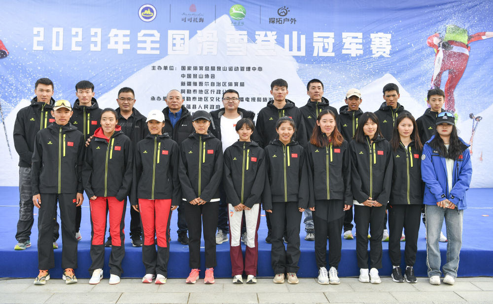 這是在首屆全國滑雪登山冠軍賽期間拍攝的布魯爾(前排左一)、次旦玉珍(前排左五)和國家集訓(xùn)隊合影(2023年4月7日攝)。新華社記者 胡虎虎 攝
