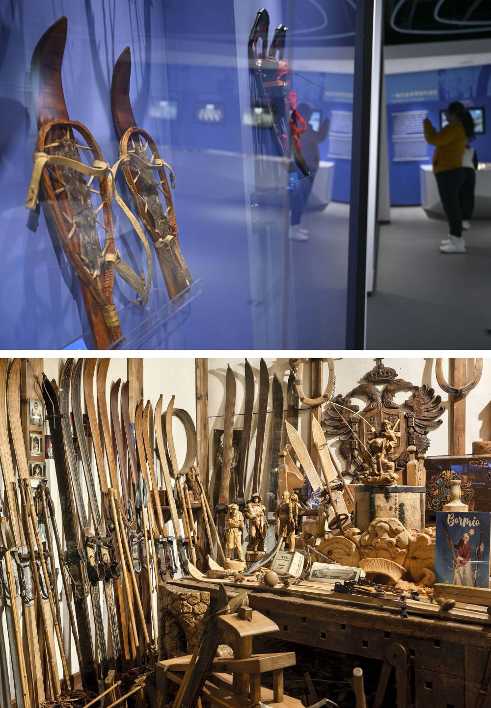 拼版照片:上圖為游客在中國新疆阿勒泰人類滑雪起源地博物館參觀(2025年1月24日攝)。下圖為在意大利博爾米奧拍攝的一家展示老式滑雪板的門店(2026年2月5日攝)。均為新華社記者 胡虎虎 攝