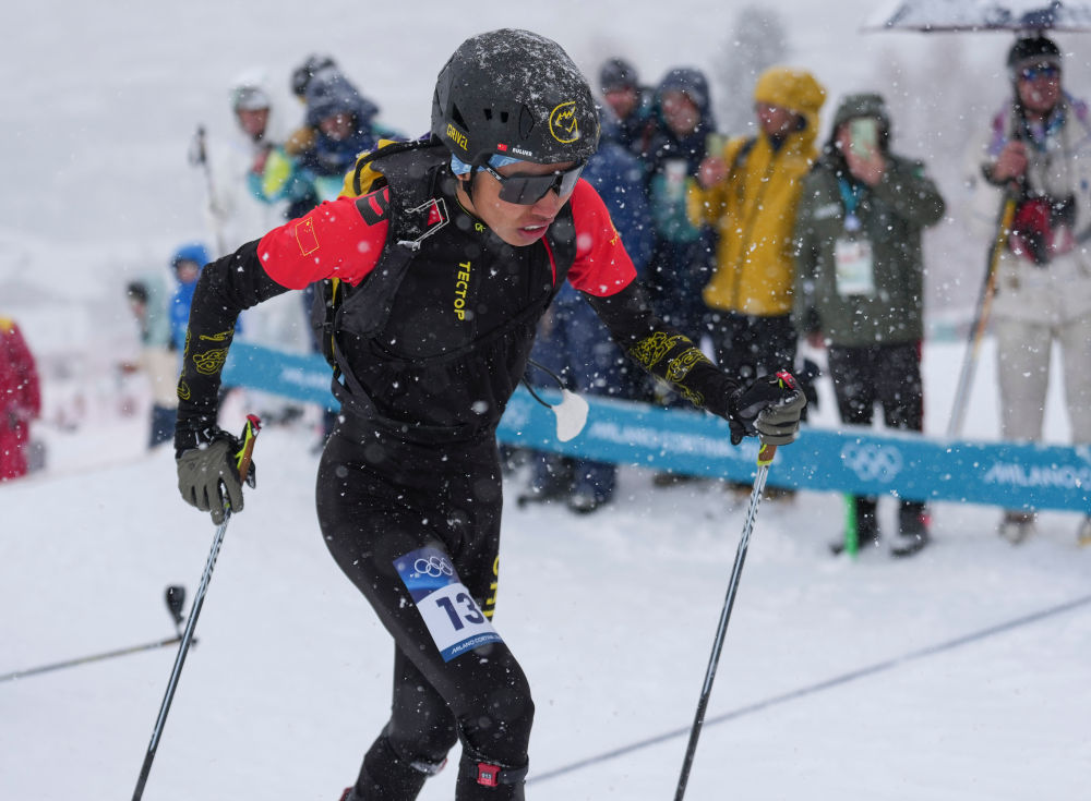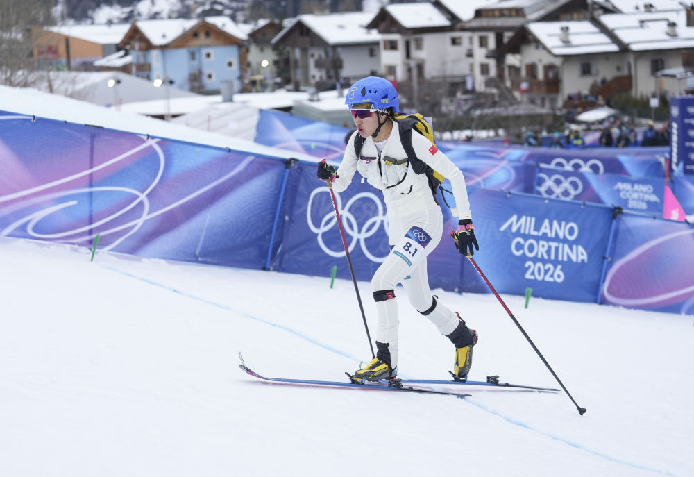 2026年2月21日,次旦玉珍在米蘭-科爾蒂納冬奧會滑雪登山混合接力比賽中。新華社記者 胡虎虎 攝