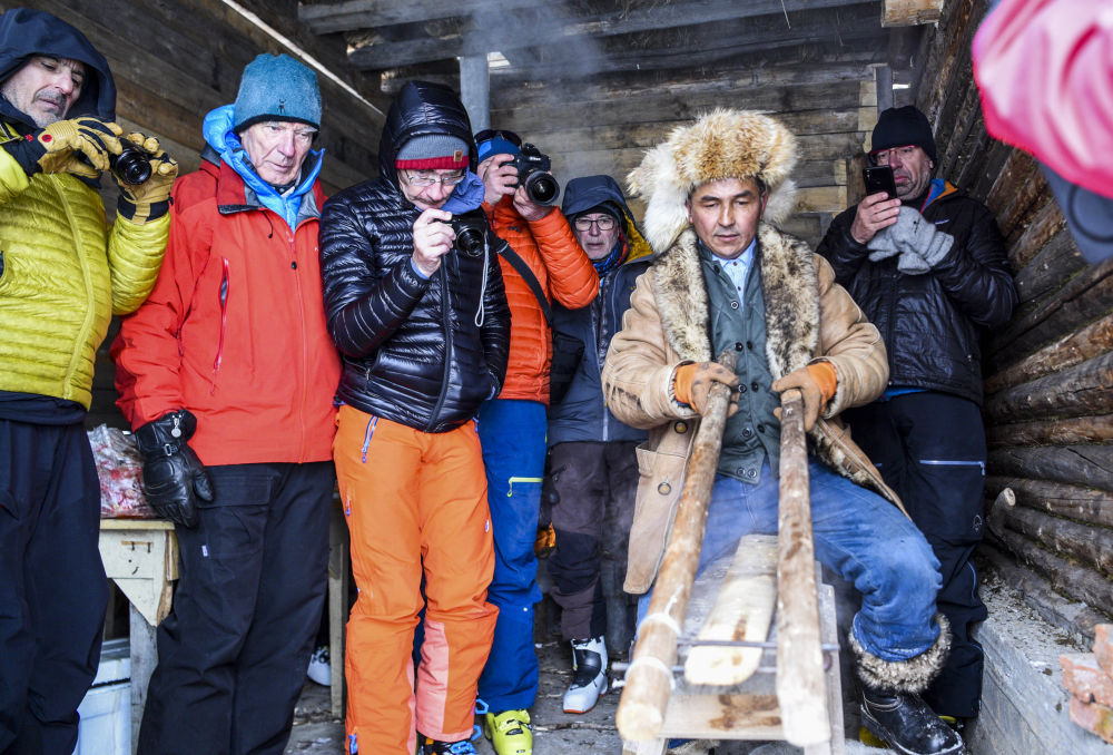 在新疆阿勒泰地區(qū)禾木村,來自歐洲的雪友觀看牧民制作古老毛皮滑雪板(2019年1月10日攝)。新華社記者 胡虎虎 攝
