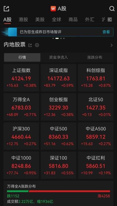 全市成交額2.22萬(wàn)億,超4200只個(gè)股上漲。
