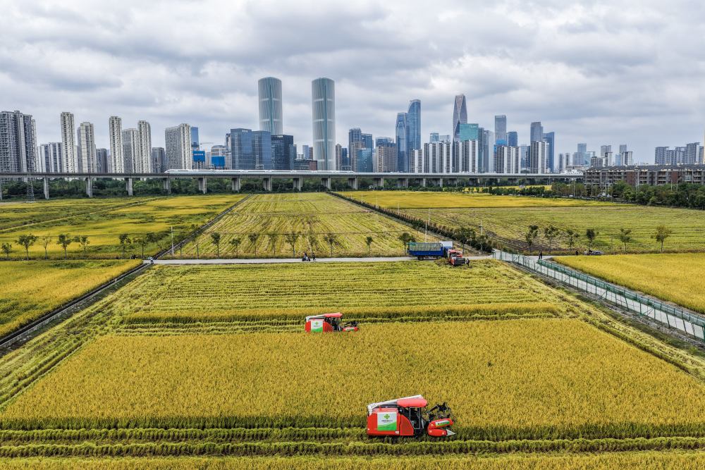 2025年10月21日,在浙江杭州蕭山區(qū),收割機(jī)在稻田里收割水稻,遠(yuǎn)處高鐵列車飛馳而過(guò)(無(wú)人機(jī)照片)。新華社記者 徐昱 攝
