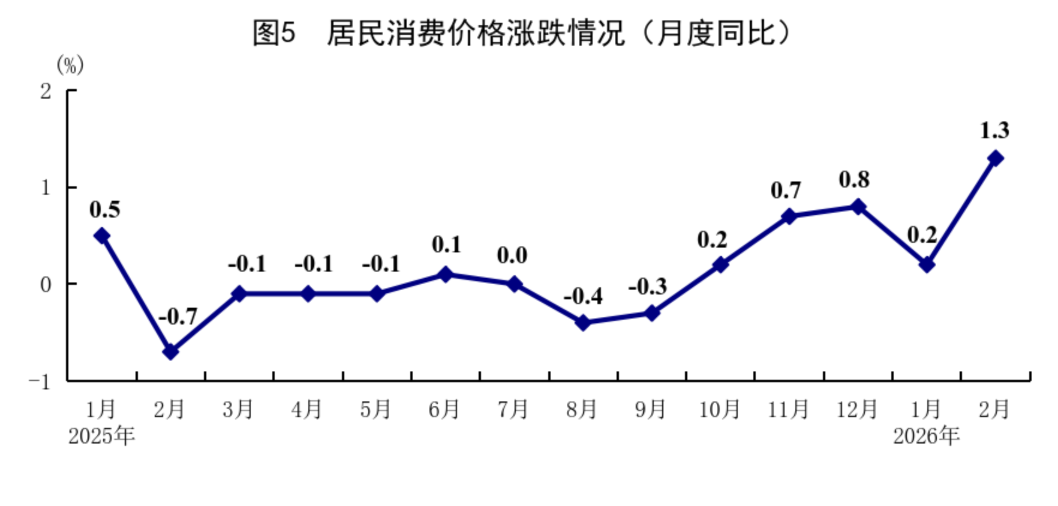 1—2月份,全國(guó)居民消費(fèi)價(jià)格(CPI)同比上漲0.8%,其中1月份上漲0.2%,2月份上漲1.3%。分類(lèi)別看,1—2月份,食品煙酒及在外餐飲價(jià)格同比上漲0.6%,衣著價(jià)格上漲1.9%,居住價(jià)格下降0.1%,生活用品及服務(wù)價(jià)格上漲2.7%,交通通信價(jià)格下降2.1%,教育文化娛樂(lè)價(jià)格上漲1.0%,醫(yī)療保健價(jià)格上漲1.8%,其他用品及服務(wù)價(jià)格上漲14.3%。在食品煙酒及在外餐飲價(jià)格中,豬肉價(jià)格下降11.2%,糧食價(jià)格下降0.2%,鮮果價(jià)格上漲4.5%,鮮菜價(jià)格上漲8.8%??鄢称泛湍茉磧r(jià)格后的核心CPI同比上漲1.3%。從環(huán)比看,1月份,全國(guó)居民消費(fèi)價(jià)格上漲0.2%,2月份上漲1.0%。