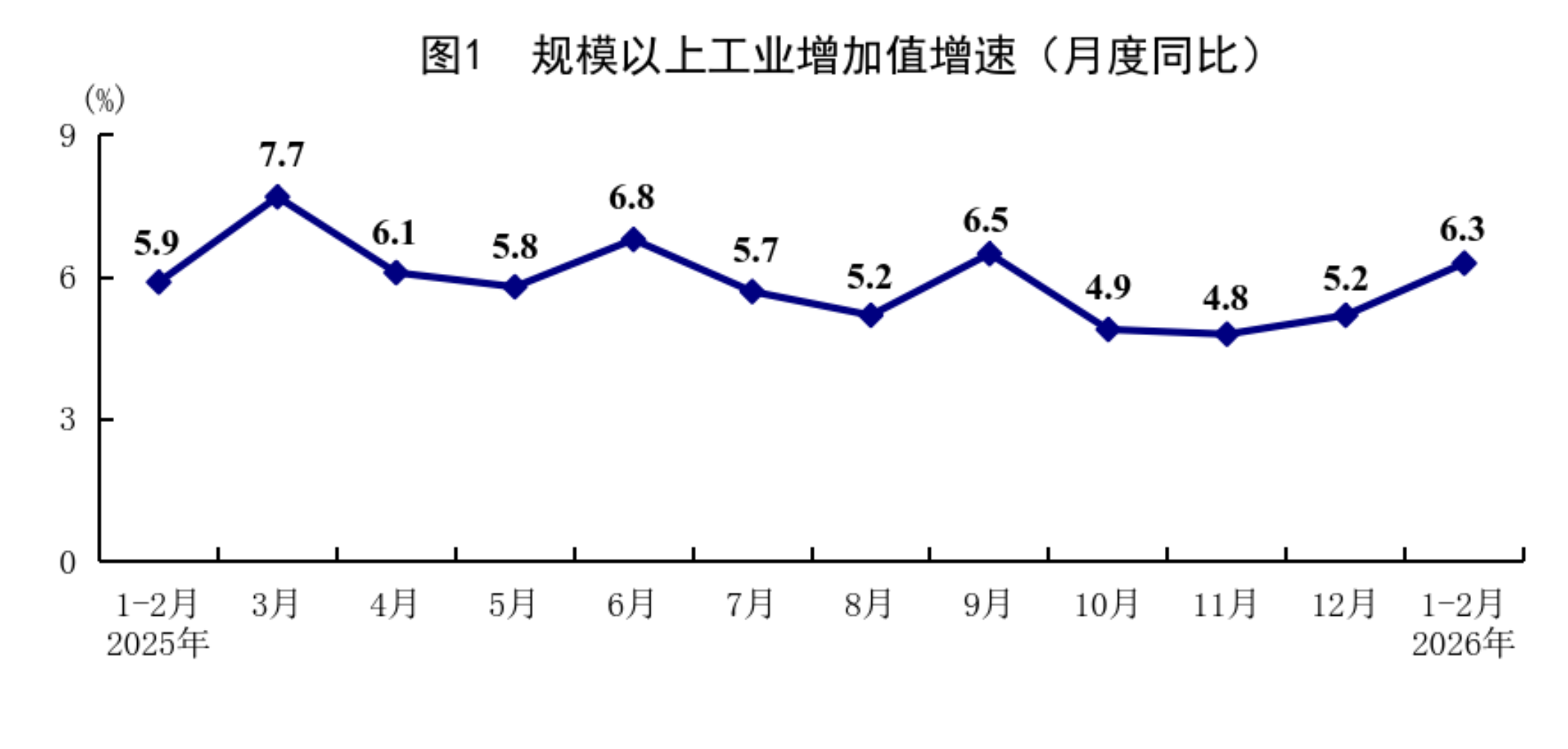 1—2月份,全國(guó)規(guī)模以上工業(yè)增加值同比增長(zhǎng)6.3%,比上年12月份加快1.1個(gè)百分點(diǎn)。分三大門(mén)類(lèi)看,采礦業(yè)增加值同比增長(zhǎng)6.1%,制造業(yè)增長(zhǎng)6.6%,電力、熱力、燃?xì)饧八a(chǎn)和供應(yīng)業(yè)增長(zhǎng)4.7%。裝備制造業(yè)增加值同比增長(zhǎng)9.3%,高技術(shù)制造業(yè)增加值增長(zhǎng)13.1%,分別快于全部規(guī)模以上工業(yè)增加值3.0和6.8個(gè)百分點(diǎn)。分經(jīng)濟(jì)類(lèi)型看,國(guó)有控股企業(yè)增加值同比增長(zhǎng)4.2%;股份制企業(yè)增長(zhǎng)6.9%,外商及港澳臺(tái)投資企業(yè)增長(zhǎng)4.0%;私營(yíng)企業(yè)增長(zhǎng)7.4%。分產(chǎn)品看,3D打印設(shè)備、鋰離子電池、工業(yè)機(jī)器人產(chǎn)品產(chǎn)量同比分別增長(zhǎng)54.1%、42.6%、31.1%。從環(huán)比看,2月份規(guī)模以上工業(yè)增加值比上月增長(zhǎng)0.83%。2月份,制造業(yè)采購(gòu)經(jīng)理指數(shù)為49.0%;企業(yè)生產(chǎn)經(jīng)營(yíng)活動(dòng)預(yù)期指數(shù)為53.2%,比上月上升0.6個(gè)百分點(diǎn)。