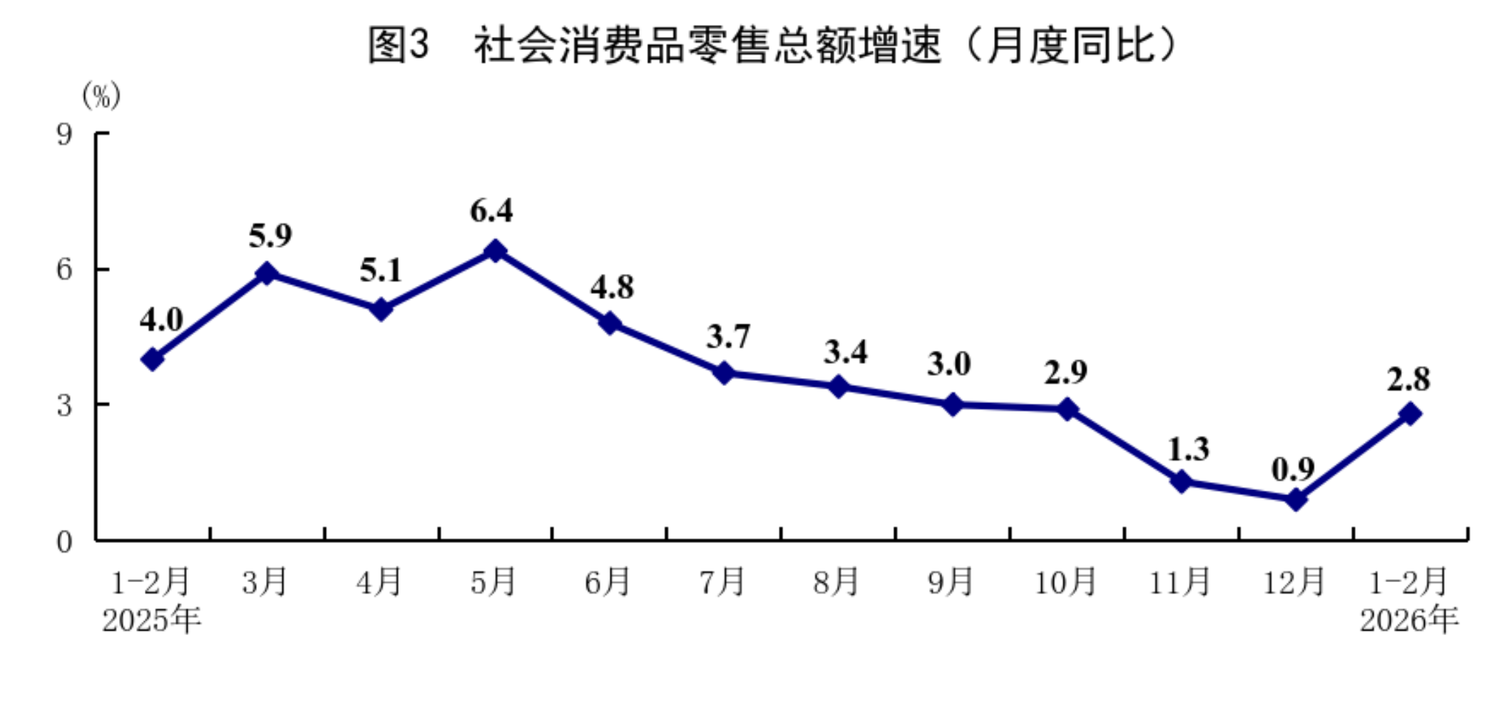 1—2月份,社會(huì)消費(fèi)品零售總額86079億元,同比增長(zhǎng)2.8%,比上年12月份加快1.9個(gè)百分點(diǎn)。按經(jīng)營(yíng)單位所在地分,城鎮(zhèn)消費(fèi)品零售額74449億元,增長(zhǎng)2.7%;鄉(xiāng)村消費(fèi)品零售額11630億元,增長(zhǎng)3.2%。按消費(fèi)類(lèi)型分,商品零售額75815億元,增長(zhǎng)2.5%;餐飲收入10264億元,增長(zhǎng)4.8%?;旧铑?lèi)和部分升級(jí)類(lèi)商品銷(xiāo)售增長(zhǎng)較快。限額以上單位服裝鞋帽針紡織品類(lèi)、糧油食品類(lèi)、通訊器材類(lèi)、金銀珠寶類(lèi)商品零售額同比分別增長(zhǎng)10.4%、10.2%、17.8%、13.0%。從環(huán)比看,2月份社會(huì)消費(fèi)品零售總額比上月增長(zhǎng)0.81%。1—2月份,服務(wù)零售額同比增長(zhǎng)5.6%,比上年全年加快0.1個(gè)百分點(diǎn)。其中,通訊信息服務(wù)類(lèi)、旅游咨詢(xún)租賃服務(wù)類(lèi)、文體休閑服務(wù)類(lèi)零售額較快增長(zhǎng)。1—2月份,全國(guó)網(wǎng)上商品和服務(wù)零售額32546億元,同比增長(zhǎng)9.2%。其中,網(wǎng)上商品零售額20812億元,增長(zhǎng)10.3%,占社會(huì)消費(fèi)品零售總額的比重為24.2%;網(wǎng)上服務(wù)零售額11734億元,增長(zhǎng)7.3%。