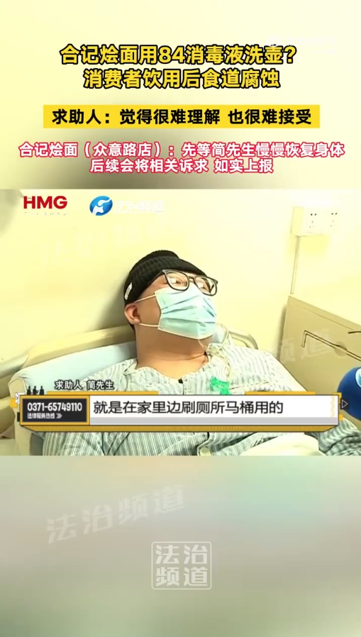 彼時,鄭州合記燴面眾意路店負責(zé)人接受媒體采訪時表示,店里平時不允許這樣做,服務(wù)員為了圖省事,私自將原本用作打掃衛(wèi)生的84消毒液,滴了一滴清洗水壺,另一名服務(wù)員在不知情的情況下拎上了餐桌。