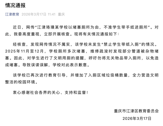 經(jīng)核查,發(fā)現(xiàn)網(wǎng)傳情況不屬實,該學校未發(fā)生“禁止學生帶紙入廁”的情況。2025年11月至12月,學校廁所多次堵塞,維修疏時發(fā)現(xiàn)部分管道被雜物堵塞。因此,對學生進行了文明用廁的提醒,呼吁勿將無關物品帶入廁所,以免造成堵塞。導致誤讀誤解,學校對此表示歉意。