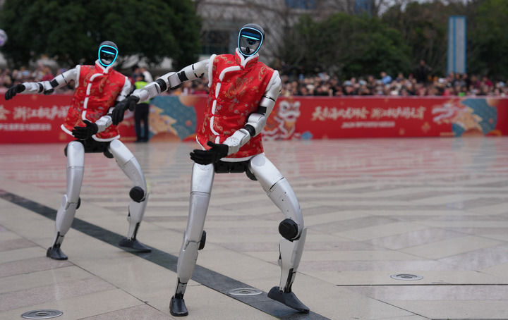 2026年2月28日,宇樹(shù)科技人形機(jī)器人在浙江省桐廬縣中心廣場(chǎng)表演舞蹈。新華社記者黃宗治 攝