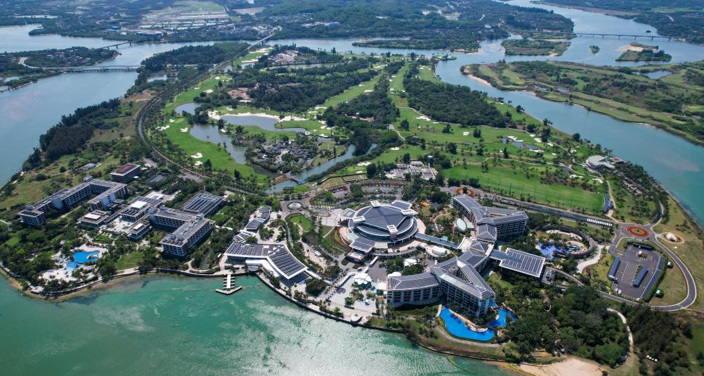 在博鰲零碳示范區(qū)拍攝的博鰲亞洲論壇國(guó)際會(huì)議中心和博鰲亞洲論壇大酒店屋頂?shù)墓夥O(shè)備(3月19日攝,無人機(jī)照片)。