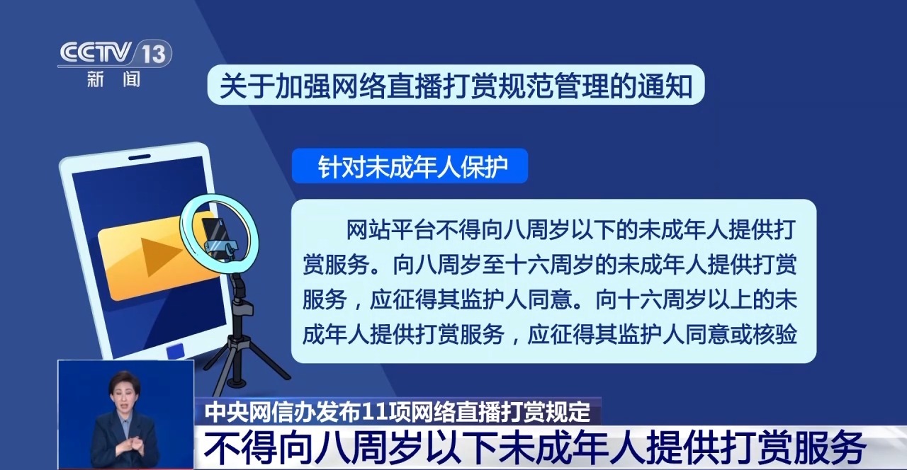 據(jù)記者了解,“通知”中提出11項具體要求,包括:明示打賞規(guī)則、規(guī)范打賞營利權(quán)限開通、完善未成年人保護(hù)機(jī)制、建立打賞營利行為負(fù)面清單、加大處置和曝光力度等。