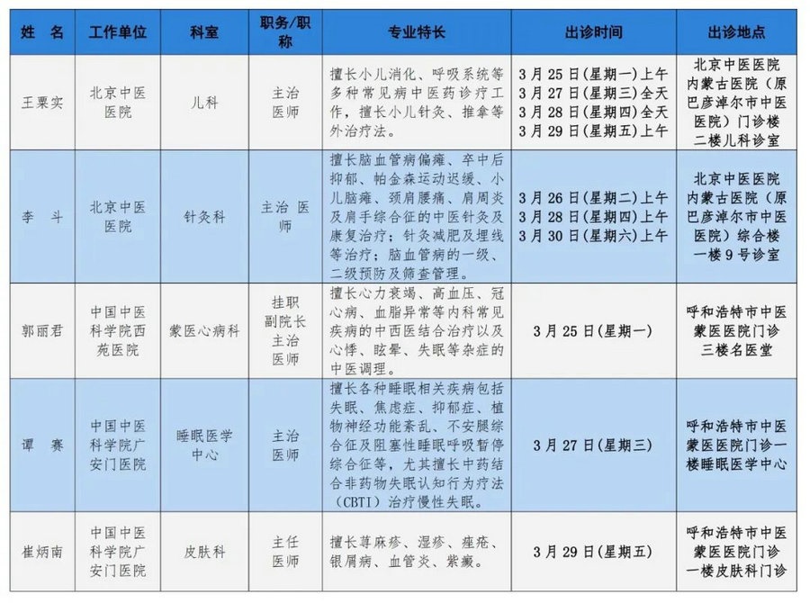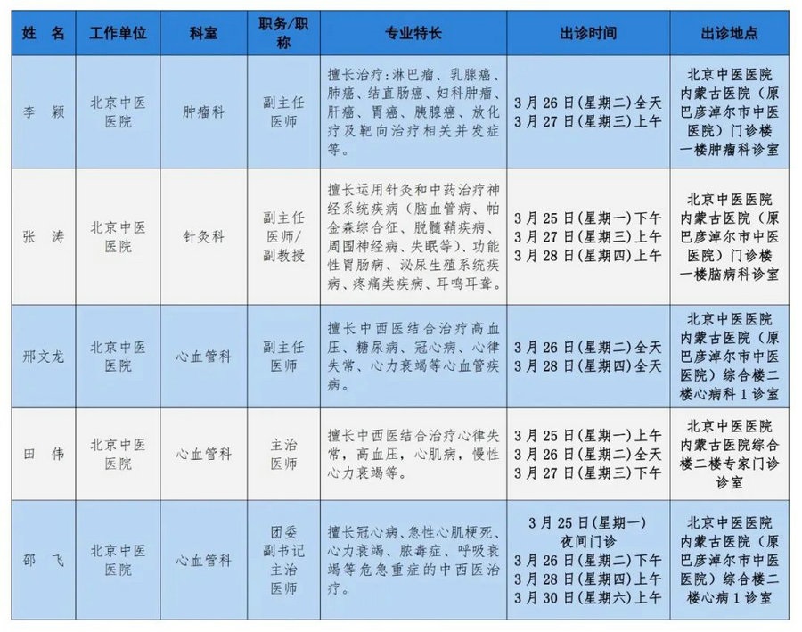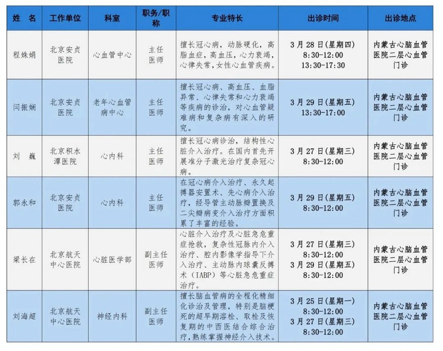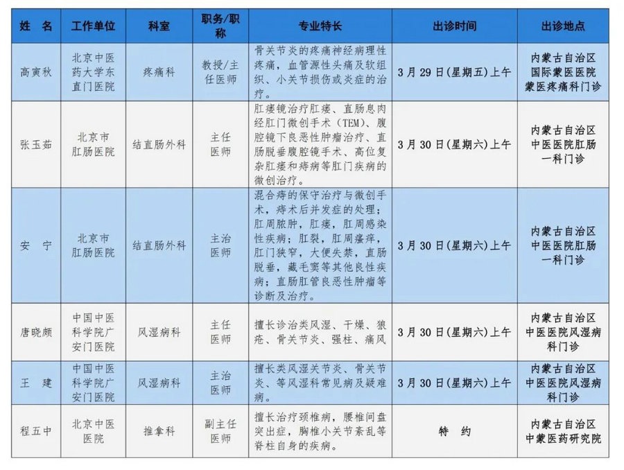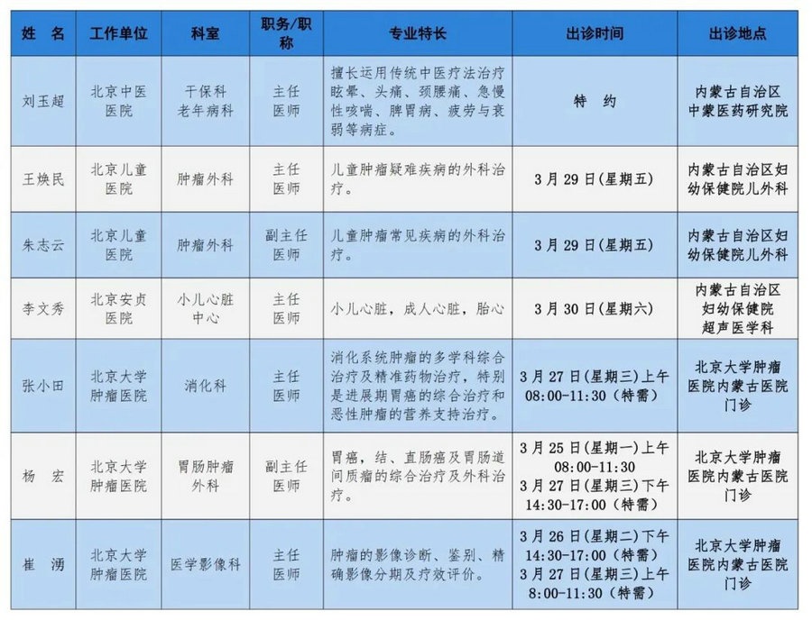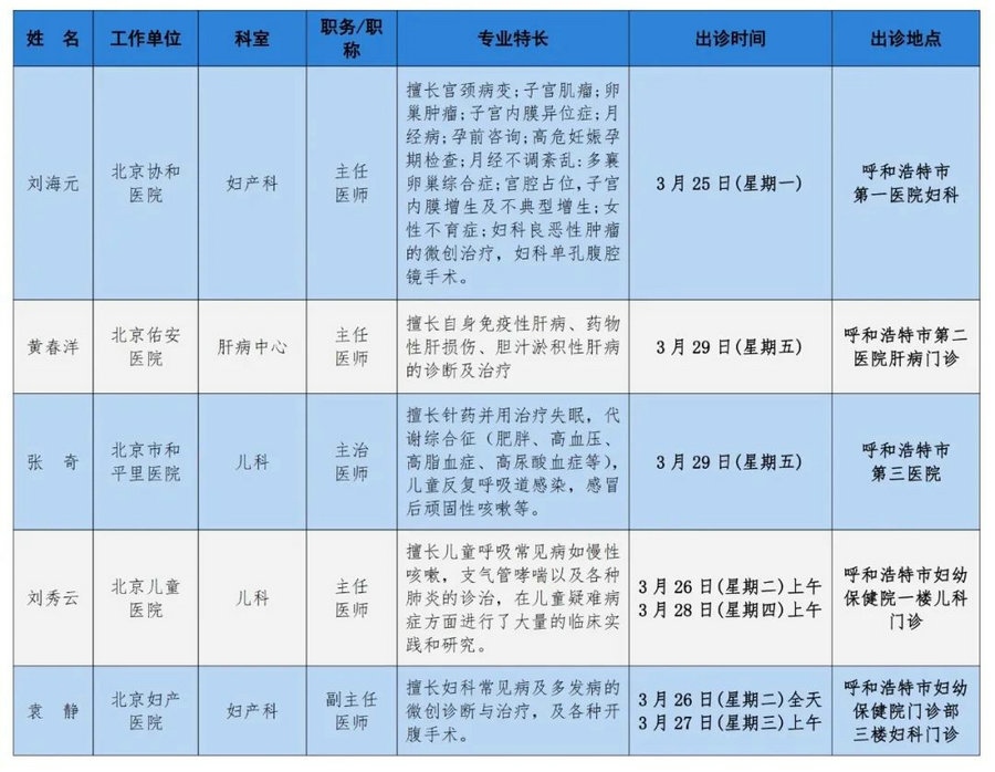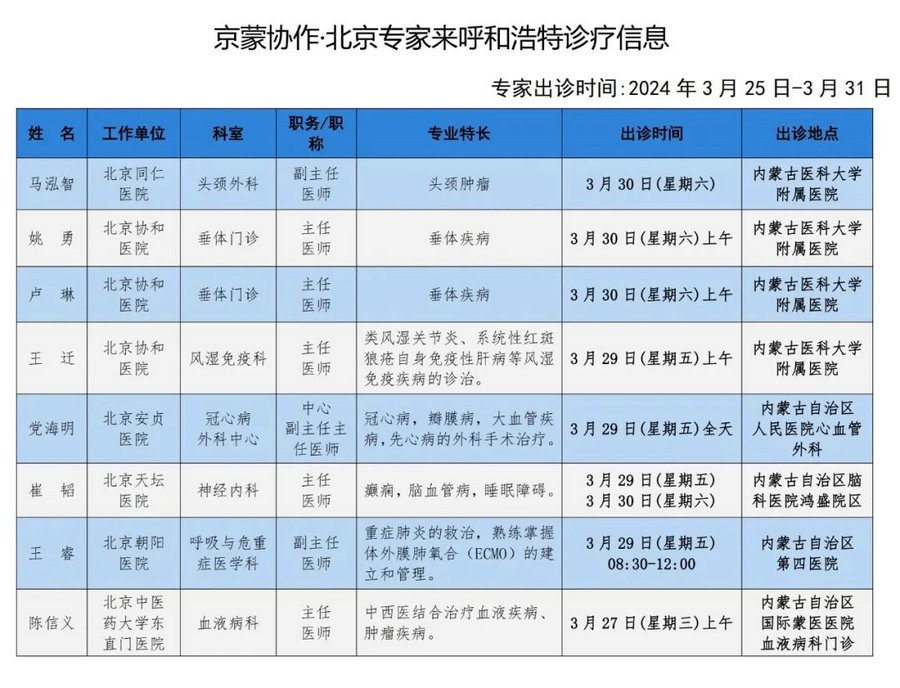 京蒙協(xié)作 政協(xié)助力。每周有北京相關(guān)協(xié)作醫(yī)院專家來(lái)呼和浩特出診,現(xiàn)將本周專家出診信息予以發(fā)布。