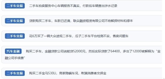 車輛報(bào)告弄虛作假,如私自篡改修車記錄、涉水記錄、里程記錄、保險(xiǎn)信息、違章信息等,消費(fèi)者付款后車輛到手使用時(shí)方才知曉;商家魚目混珠、以次充好,刻意隱瞞車輛來源,運(yùn)營車充當(dāng)非運(yùn)營車輛賣,涉案車輛充當(dāng)正常車輛賣;訂金、押金、保證金隨意收,取消交易后商家拒不退還;交易合同陷阱多,發(fā)票真假難辨,車輛售后維修服務(wù)難保障;實(shí)際貸款數(shù)額與申請(qǐng)額度不符、手續(xù)費(fèi)多少不明了、提前還款收取高額違約金,金融貸款“陷阱”防不勝防……
