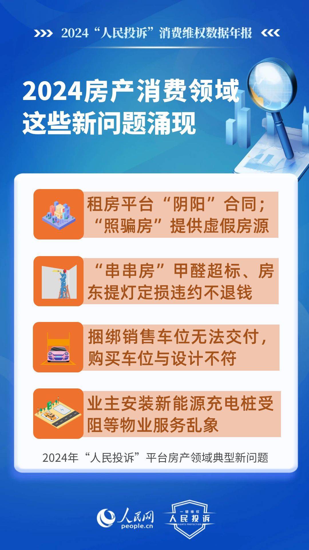 新問題體現(xiàn)在:租房平臺“陰陽”合同、提供虛假房源、甲醛超標(biāo)不退款、違約不退定金/押金等;捆綁銷售車位無法交付,購買車位與設(shè)計(jì)不符,人防車位/不合格機(jī)械車位當(dāng)普通車位賣,無法正常使用,業(yè)主安裝充電樁受阻等。
