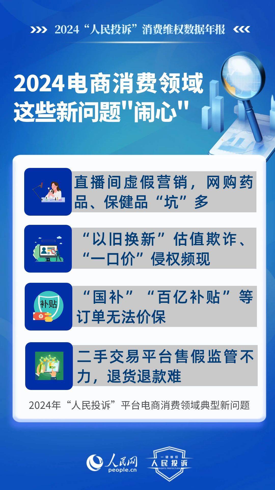 新問題體現(xiàn)在:直播間虛假營銷,購買玉石/網(wǎng)課/旅游產(chǎn)品等消費(fèi)“踩雷”多;“以舊換新”估值欺詐、“一口價(jià)”侵權(quán)頻現(xiàn);“國補(bǔ)”“百億補(bǔ)貼”訂單不給價(jià)保;二手交易平臺對商家售假監(jiān)管不力、“陰陽”檢測、退貨退款難;網(wǎng)購藥品/保健品/醫(yī)療器械“坑”多等。
