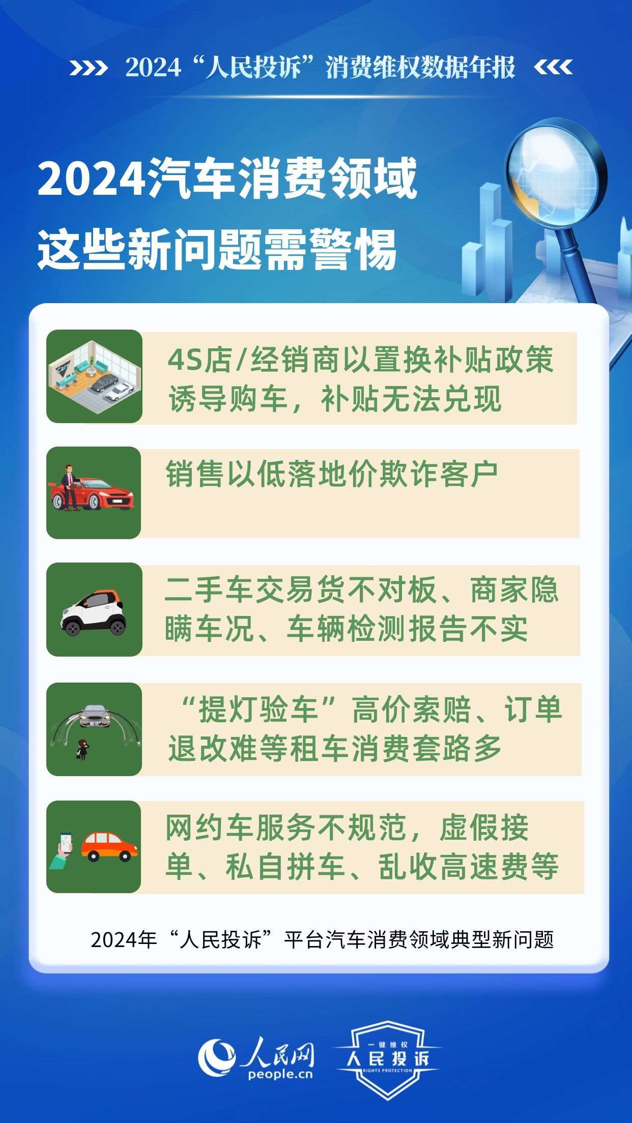 新問題體現(xiàn)在:4S店/經(jīng)銷商以置換補(bǔ)貼政策誘導(dǎo)購車,結(jié)果補(bǔ)貼無法兌現(xiàn);銷售以低落地價(jià)欺詐客戶;二手車交易貨不對板、商家隱瞞車況、平臺車輛檢測報(bào)告不實(shí);惡意租“故障車”、“提燈驗(yàn)車”高價(jià)索賠、低價(jià)誘租、訂單退改難等租車消費(fèi)套路多;網(wǎng)約車服務(wù)不規(guī)范,人車不符、虛假接單、私自拼車、亂收高速費(fèi)等。