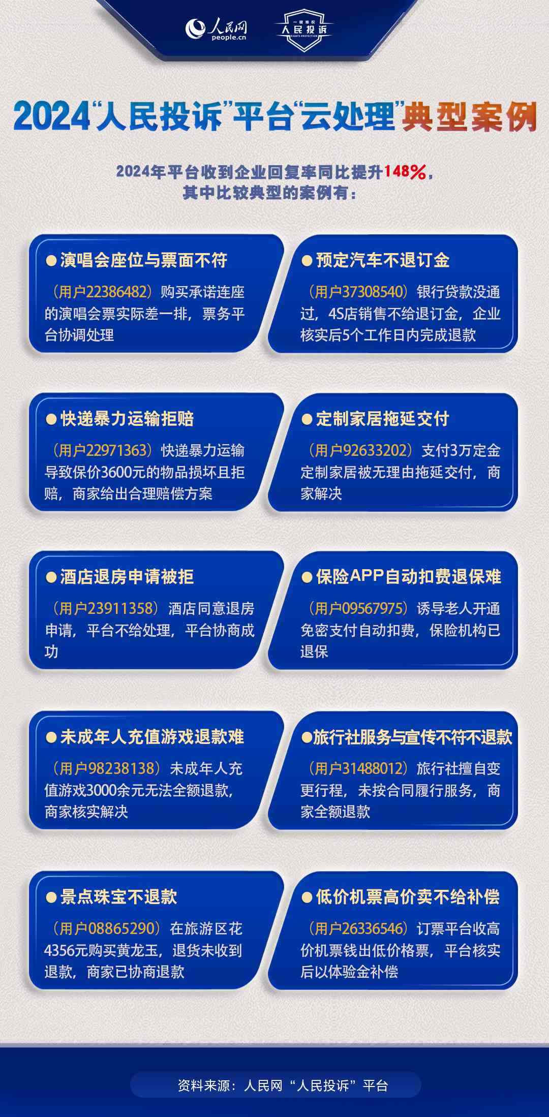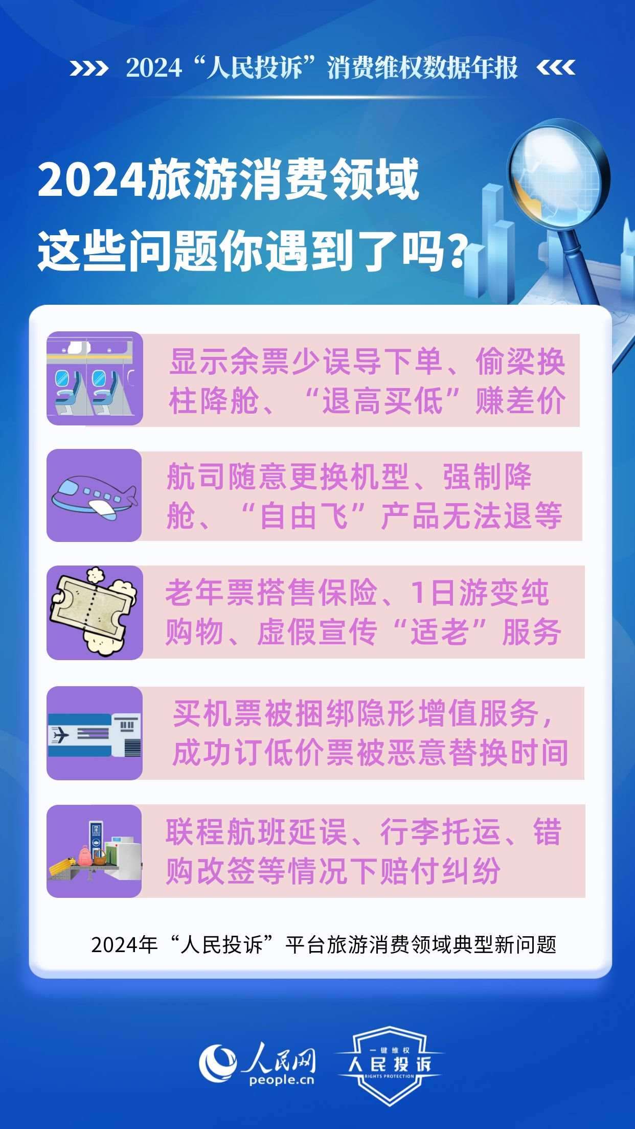 2024年,旅游消費(fèi)持續(xù)火爆,以舊換新“換”出消費(fèi)新活力,直播電商“品質(zhì)化”轉(zhuǎn)型,新能源汽車購銷兩旺……在消費(fèi)市場熱力持續(xù)提升的背景下,旅游產(chǎn)品退訂難,電商促銷虛假價(jià)保,直播間營銷違規(guī),車險(xiǎn)車貸服務(wù)欺詐,AI培訓(xùn)貨不對板等消費(fèi)侵權(quán)問題引發(fā)廣泛關(guān)注。“人民投訴”發(fā)布年報(bào)帶您回顧這一年來,平臺消費(fèi)維權(quán)熱點(diǎn)和入駐企業(yè)積極處理糾紛的舉措。
