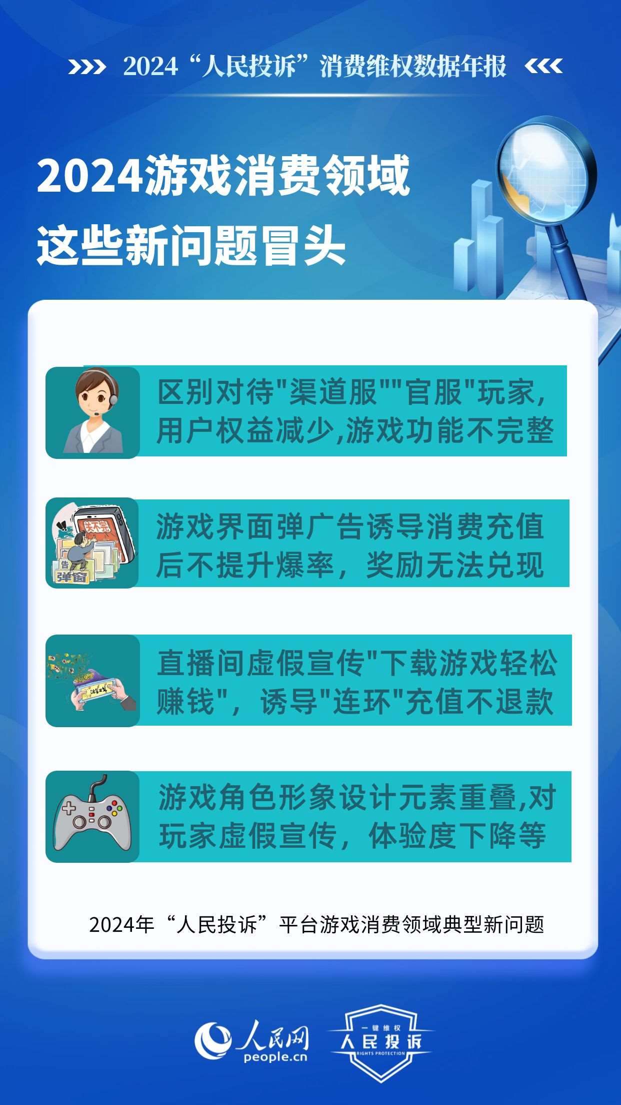 在游戲類,老問題主要有:未成年人網(wǎng)游消費(fèi)不規(guī)范,平臺以“免費(fèi)”“紅包”誘導(dǎo)點(diǎn)擊充值,未身份驗(yàn)證、支付環(huán)節(jié)無提示,提交證據(jù)申請退款遭拒或退款金額不合理;虛假宣傳游戲內(nèi)容誘導(dǎo)充值點(diǎn)券,玩家實(shí)際回報(bào)/游戲體驗(yàn)與預(yù)期不符;無故封號、游戲裝備丟失、賬號被盜、系統(tǒng)漏洞導(dǎo)致玩家利益受損,客服不回應(yīng)、平臺不理;系統(tǒng)漏洞、卡頓閃退、匹配機(jī)制失衡等網(wǎng)游體驗(yàn)差等。