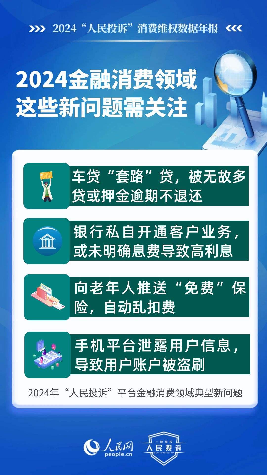 新問題體現(xiàn)在:車貸“套路”貸,被無故多貸或押金逾期不退還;銀行私自開通客戶銀行卡業(yè)務(wù),或未向客戶明確息費(fèi)導(dǎo)致高額利息;小程序誘導(dǎo)充值后提現(xiàn)欺詐;支付平臺向老年人推送“免費(fèi)”保險(xiǎn),自動(dòng)亂扣費(fèi);手機(jī)平臺泄露用戶信息,導(dǎo)致用戶賬戶被盜刷、微信錢包被自動(dòng)扣款等;跨境電商運(yùn)營App誘導(dǎo)高額充值后無法提現(xiàn)、不退款等。