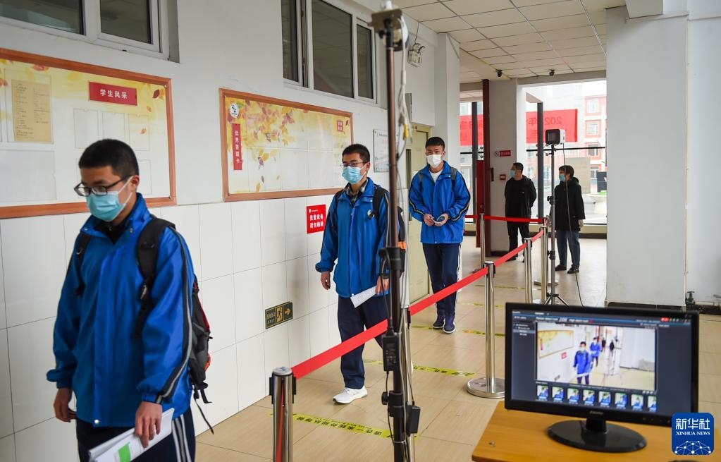 4月1日,高三年級學生走進呼和浩特市鐵路第二中學教學樓,體溫檢測設備查驗學生體溫。