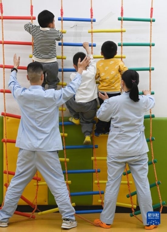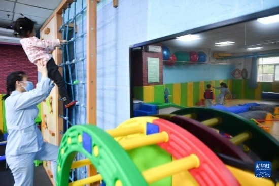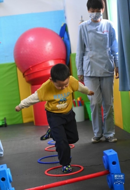 3月30日,在西安市金色陽光康復中心,孩子們在特教老師的保護下進行康復訓練。
