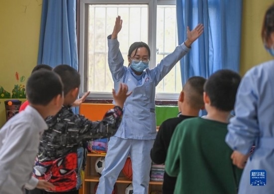 3月30日,在西安市金色陽光康復中心,特教老師引導孩子們做體操。