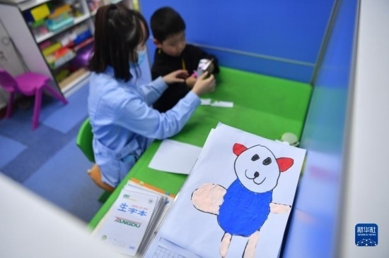 3月30日,在西安市金色陽光康復中心,特教老師(左)指導孩子進行康復訓練。