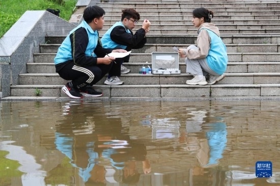 4月29日,在衡陽縣西渡鎮(zhèn)新橋村,南華大學(xué)的大學(xué)生志愿者在檢測(cè)水質(zhì)。