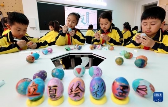 5月5日,在山東省棗莊市東湖小學(xué),學(xué)生們在繪制彩蛋。