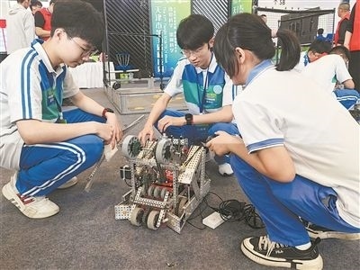 中學(xué)生在組裝機(jī)器人準(zhǔn)備比賽。記者 陳曦?cái)z