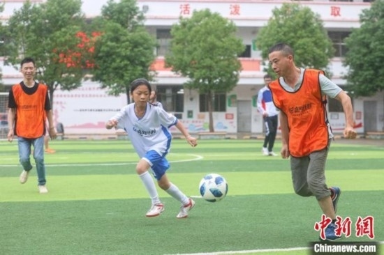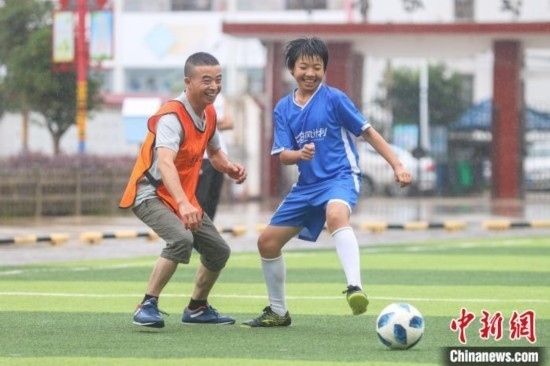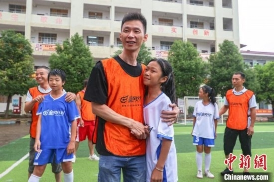 “今天第一次和爸爸踢球,我特別高興和感動(dòng)。他踢得很好,還帶球過(guò)了我?guī)状?。我希望爸爸以后能多陪我踢球?!?4日,在江西贛州尋烏縣澄江中心校的足球場(chǎng)上,來(lái)自該校晨曦女子足球隊(duì)的隊(duì)員廖怡菱和其他四位隊(duì)員在父親節(jié)前夕,驚喜地見(jiàn)到了自己身在外地工作的父親,并第一次和父親一起踢球,進(jìn)行了一場(chǎng)特別的親子足球賽。