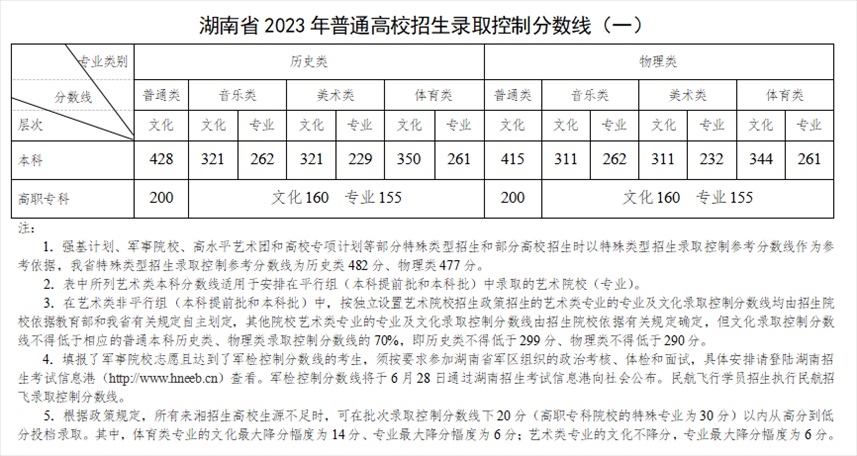 人民網(wǎng)北京6月25日電 據(jù)湖南省教育考試院消息,今天,湖南省2023年普通高校招生各批次錄取控制分?jǐn)?shù)線公布,本科普通類中,歷史類428分、物理類415分;特殊類型招生錄取控制參考分?jǐn)?shù)線中,歷史類482分、物理類477分。(李依環(huán)、實習(xí)生張婉柔)