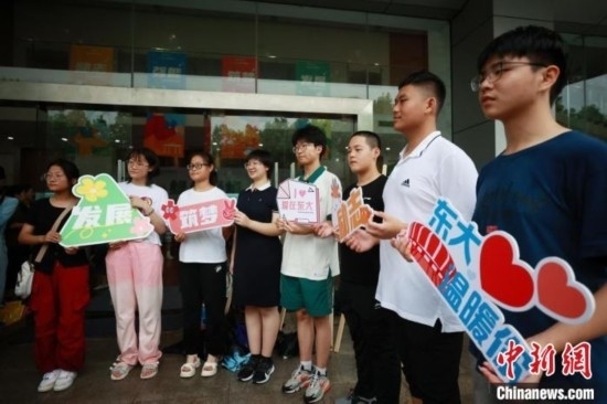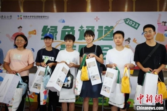 東南大學(xué)迎來4117名本科新生,在設(shè)立的綠色通道處,師生們合影。泱波 攝
