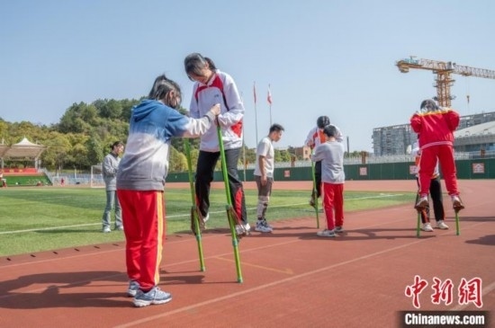 3月19日,兩地學(xué)生一起體驗(yàn)少數(shù)民族傳統(tǒng)體育項(xiàng)目《高蹺》。唐哲 攝