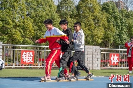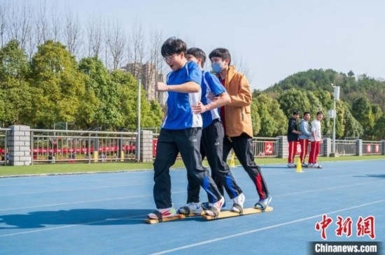 3月19日,兩地學(xué)生一起體驗(yàn)少數(shù)民族傳統(tǒng)體育項(xiàng)目《板鞋競技》。唐哲 攝