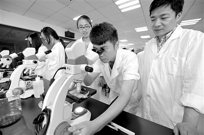 杭州職業(yè)技術(shù)學(xué)院生物制藥專業(yè)客座教授、杭州市首席技師章飛龍(右一)正在指導(dǎo)學(xué)生實(shí)訓(xùn)。