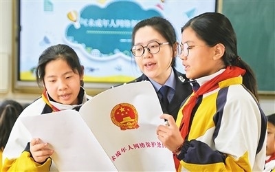 江蘇省海安市公安局城西派出所民警向小學(xué)生講解《未成年人網(wǎng)絡(luò)保護(hù)條例》。周 強(qiáng)攝(人民圖片)
