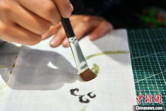 貴州織金苗族蠟染2021年6月入選國(guó)務(wù)院公布第五批國(guó)家級(jí)非物質(zhì)文化遺產(chǎn)代表性項(xiàng)目名錄?!?5后”苗族女孩王秋雨大學(xué)畢業(yè)后回到織金,成為一名織金苗族蠟染推廣者。她不僅使用傳統(tǒng)小臘刀,還使用大臘刀和毛筆,以蜂蠟為墨在絲巾、衣服、箱包上繪制小篆、甲骨文、山水等文字與圖案,這些蠟染產(chǎn)品深受消費(fèi)者喜愛(ài)。圖為6月19日,王秋雨在織金縣平遠(yuǎn)古鎮(zhèn)的依文織金數(shù)字化展廳制作蠟染。周燕玲 攝