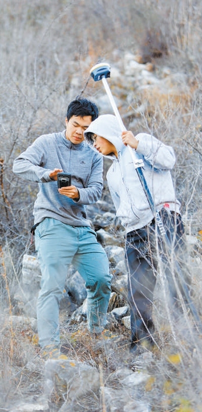 北京聯(lián)合大學(xué)地理學(xué)碩士研究生在北京房山區(qū)穆家口古城址四普現(xiàn)場測量文物地理坐標(biāo)。