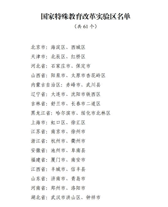 記者2月10日從教育部獲悉,經(jīng)各地自主申報、省級推薦、網(wǎng)絡(luò)公示等環(huán)節(jié),認定北京市海淀區(qū)等61個國家特殊教育改革實驗區(qū)。