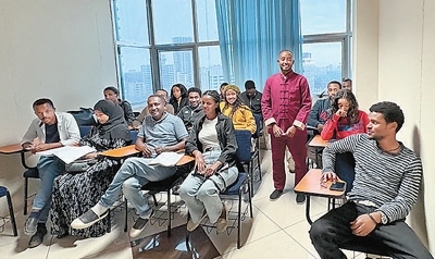 2021年,卡利布學成回到埃塞俄比亞,發(fā)現(xiàn)很多埃塞人有學習中文的需求,便開辦了“你好”中文學校。針對當?shù)厝说陌l(fā)音和學習習慣,開發(fā)了阿姆哈拉語和中文雙語教材,在當?shù)刂形慕逃I域獨樹一幟,吸引了上百名學員。這些學員不僅有即將赴中國留學的學生,還有與中國有生意往來的商人等。此外,卡利布教學內(nèi)容的一部分是教中國人學習阿姆哈拉語,旨在幫助大家更好地融入當?shù)厣睢?/p>