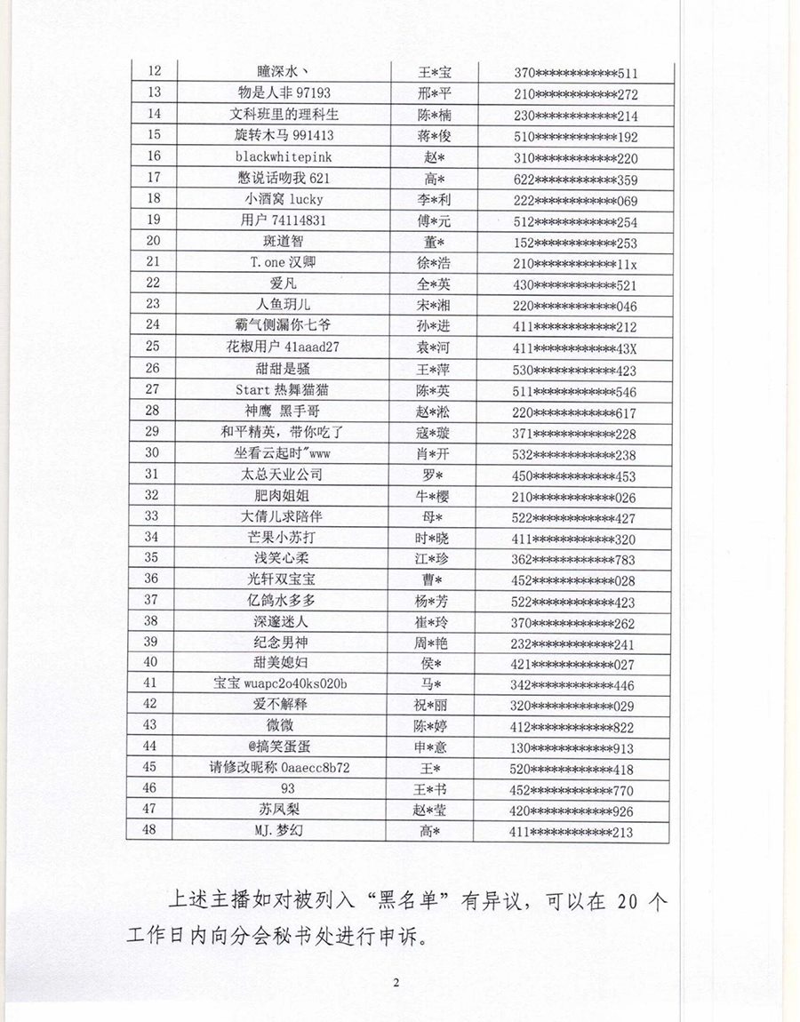 根據(jù)《互聯(lián)網(wǎng)文化管理暫行規(guī)定》《網(wǎng)絡(luò)表演經(jīng)營(yíng)活動(dòng)管理辦法》《互聯(lián)網(wǎng)直播服務(wù)管理規(guī)定》等相關(guān)法律法規(guī),按照《網(wǎng)絡(luò)表演(直播)行業(yè)主播“黑名單”管理制度》《黑名單認(rèn)定工作流程》規(guī)定,中國(guó)演出行業(yè)協(xié)會(huì)網(wǎng)絡(luò)表演(直播)分會(huì)現(xiàn)向社會(huì)公布第六批主播黑名單,被列入黑名單的主播將在行業(yè)內(nèi)禁止注冊(cè)和直播,封禁期限5年。(總臺(tái)央視記者曹巖)